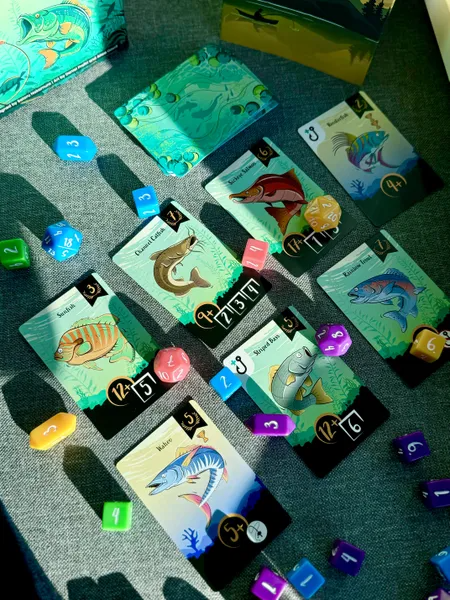 Lure is a game about catching fish. It uses a clever dice bidding mechanism to determine who gets to try to catch fish first. Each player selects a number of dice hidden behind their sheild. Once everyone has selected, the dice are revealed. The player that selected the lowest number of dice gets to catch fish first. They roll their dice and compare the results against the fish on the table. The fish all have a number value that must be met along with other requirements like using a lure or rolling specific numbers. The bidding matters because if you bid too many dice you may never even get a chance to roll if the other players have already caught everything. I like this dice bidding mechanism so much that I have said if I ever design my own game it will revolve around it.